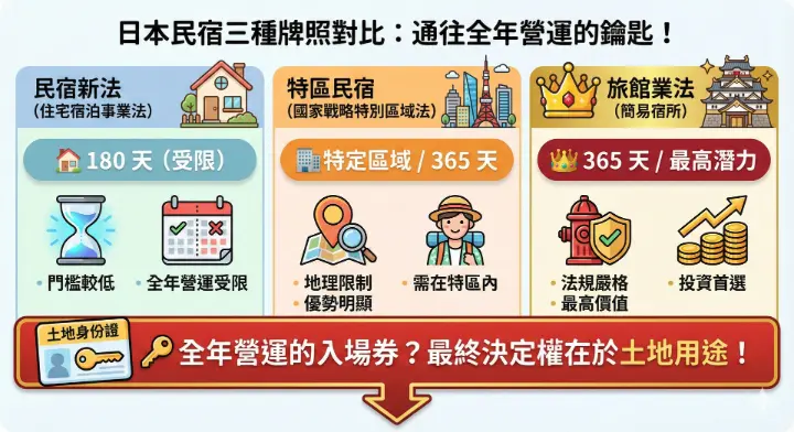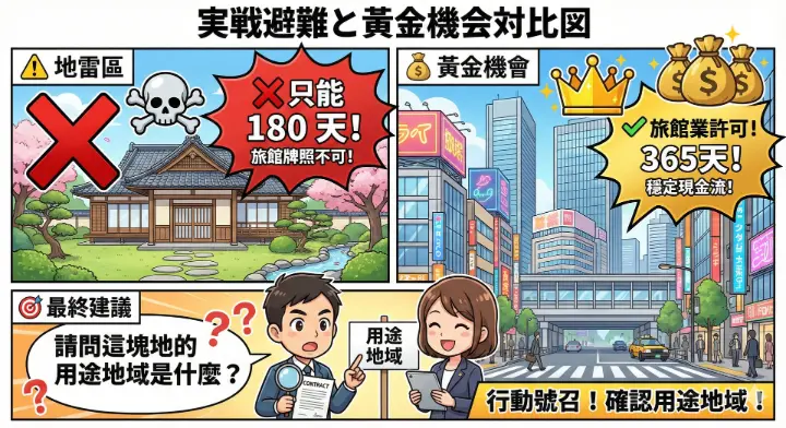 | 土地用途地域 (Use District) | 🟢 民宿新法 (180天) | 👑 旅館業法 (365天) | 💡 投資實務建議 (專家點評) |