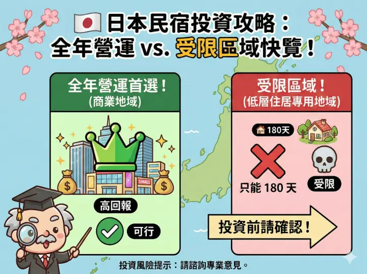(註:以上為國家法規一般標準。日本各地自治體(如京都市、東京各區)可能有更嚴格的「上乘條例」,例如限制只能在週末營業。投資前務必進行個案確認!)