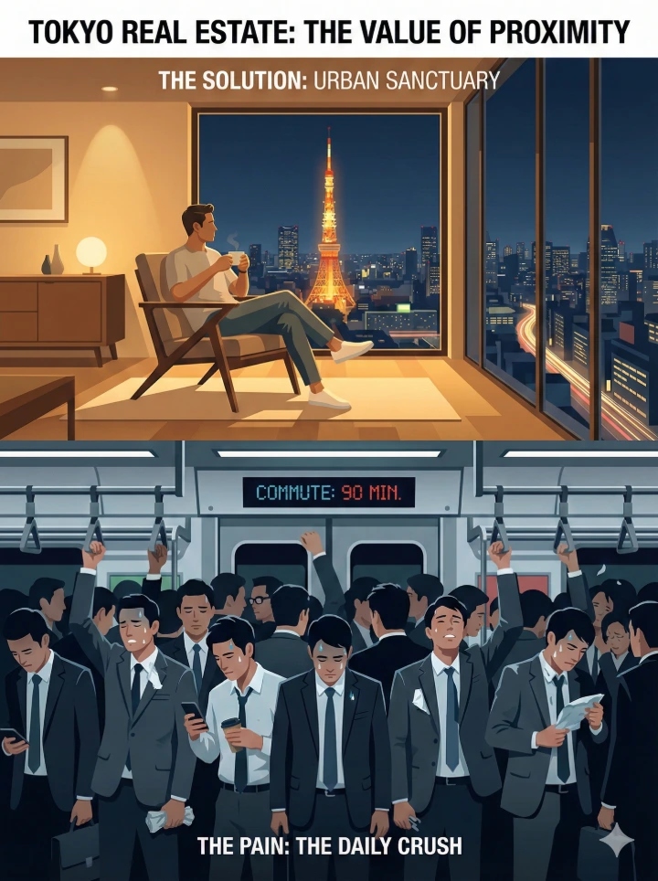 當每週必須進辦公室 4-5 天,面對重回擁擠巔峰的通勤電車,高收入族群(特別是 DINKS 雙薪家庭與單身菁英)的痛點被極限放大。他們不願再將生命浪費在神奈川或千葉往返東京的 2 小時通勤上。