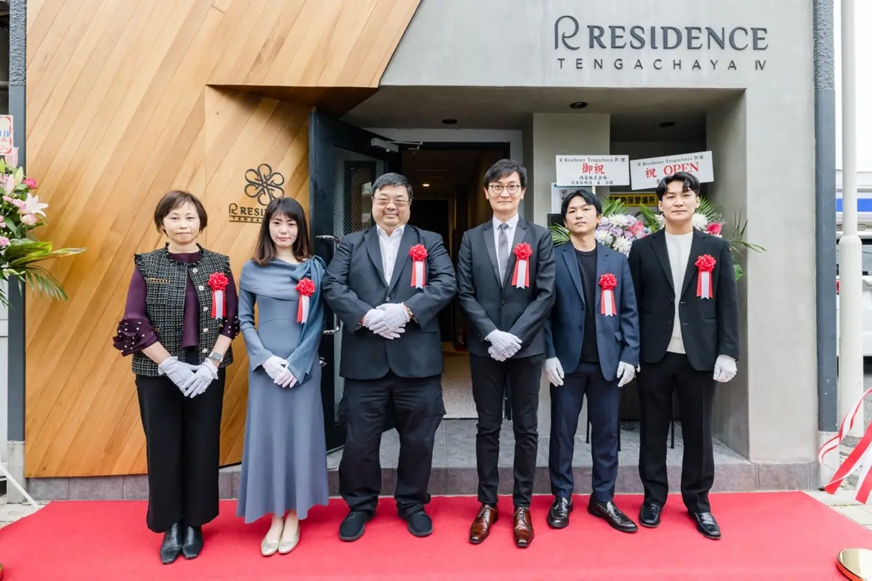 Roy Yip (centre) cuts the ribbon at the opening of R Residence Tengachaya IV in Osaka, unveiling the group’s newest serviced‑apartment property.