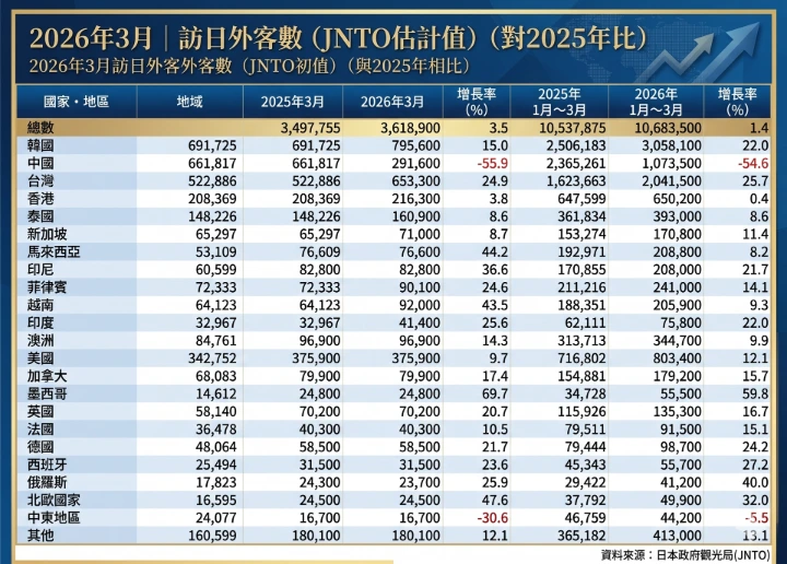 • 市場動態: 在春季賞櫻熱潮的強力帶動下,3 月份訪日人數創下歷史單月最高紀錄,同時也宣告 2026 年第一季順利突破千萬大關。