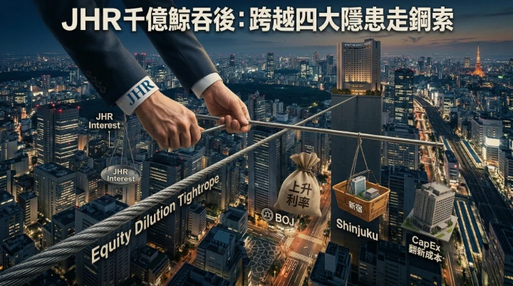 利率正常化下的財務壓力測試 (Rising Debt Burden): 即便有一半資金來自股權,但剩餘龐大的資金缺口仍需舉債。在日本央行(BOJ)明確邁向升息的 2026 年,龐大的新債務將使 JHR 面臨更高的利息支出。經營團隊的利率避險(Interest Rate Swap)佈局是否完善,將決定其現金流的生死。