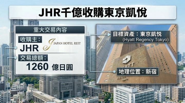 2026 年 3 月中旬,日本國內資產規模最大的酒店房地產信託基金——Japan Hotel REIT Investment Corp(簡稱 JHR,代號:8985.T)投下了震撼市場的震撼彈:宣佈以高達 1,260 億日圓的總作價,收購東京新宿區地標——Hyatt Regency Tokyo(東京凱悅酒店)。