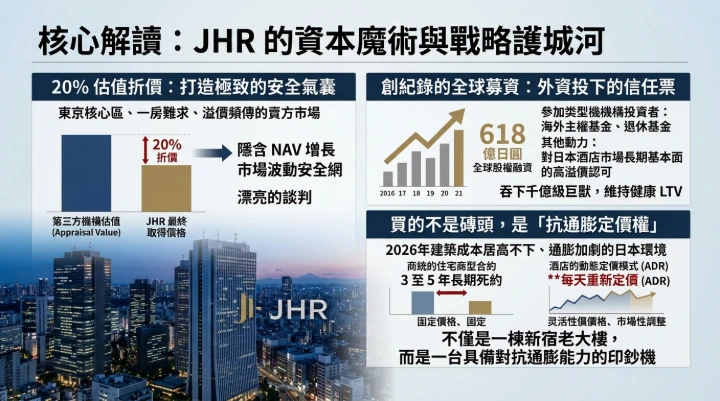 20% 估值折價:打造極致的安全氣囊 (Margin of Safety) 公告揭露,JHR 最終的取得價格,較第三方機構的市場估值(Appraisal Value)大幅折價近 20%。在目前東京核心區酒店「一房難求、溢價頻傳」的絕對賣方市場中,能以如此深的折扣拿下新宿核心地標,無疑是一次漂亮的談判。這 20% 的折價直接轉化為基金帳面上的隱含資產淨值(NAV)增長,為未來的市場波動墊高了極佳的安全防護網。