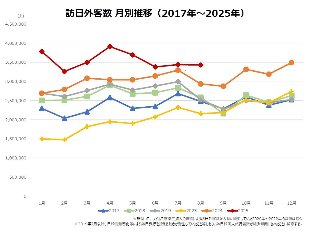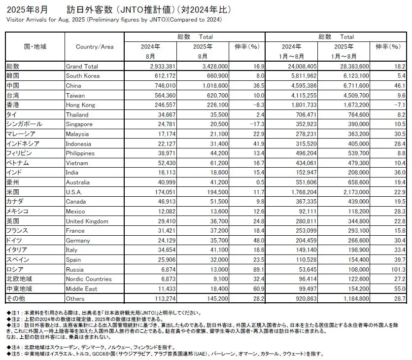 (數據來源:日本政府觀光局(JNTO)2025年8月訪日外客數推計值)