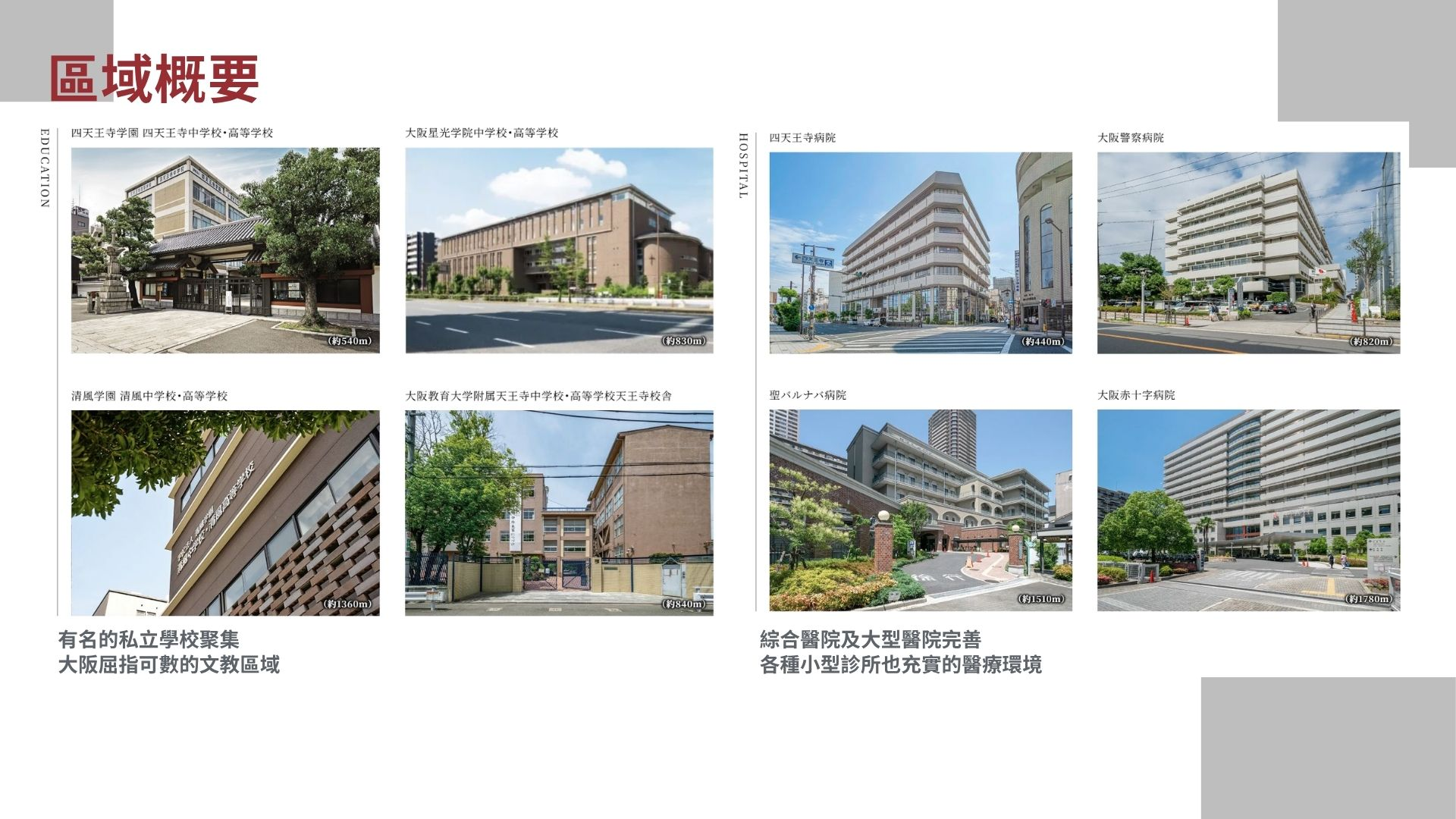 超市資源亦配置完善,鄰近設有 Harves、Life 等大型超市,滿足家庭日常採購需求。綠地方面,天王寺公園提供了廣闊的休憩空間,住戶可享受都市綠洲的悠閒。公共設施如天王寺區役所、區立圖書館、郵局等皆在步行可達範圍內,確保日常生活服務的便捷性。此地同時坐擁優質教育資源,鄰近大阪市立常盤小學、大阪市立天王寺中學等,為重視子女教育的家庭提供理想選擇。